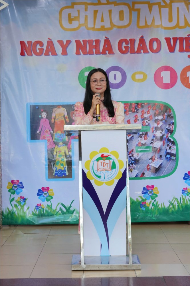 🎗️ Trong diễn văn đầy lắng đọng, cô Phạm Thị Kim Loan – Hiệu trưởng nhà trường, đã gửi lời tri ân sâu sắc đến những người thầy, người cô luôn tận tụy đồng hành cùng học sinh; đồng thời chúc mừng những thành tựu nổi bật mà tập thể giáo viên và học sinh đã đạt được. Cô bày tỏ niềm tin và kỳ vọng vào tập thể nhà trường và học sinh sẽ tiếp tục gìn giữ, phát huy truyền thống tốt đẹp của nhà trường và cùng chung tay viết tiếp những trang sử vàng của nền giáo dục Thành phố.